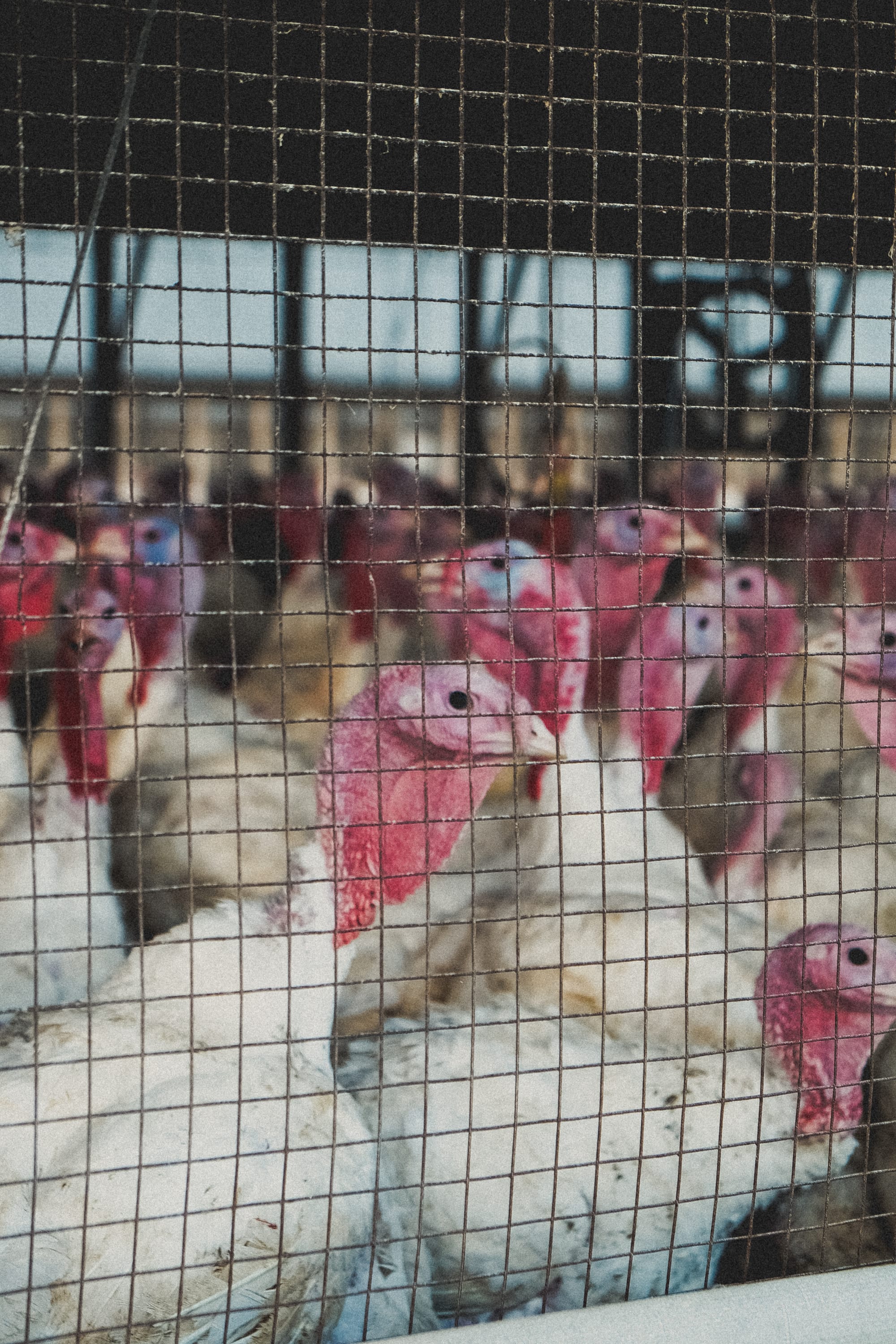karl and i had pulled into the open gate of his turkey farm, parking in the entrance. i ran up to the turkey houses to photograph the bleach-white birds in captivity. they looked alien, sickly. a couple more weeks and they'd be fat enough for slaughter.